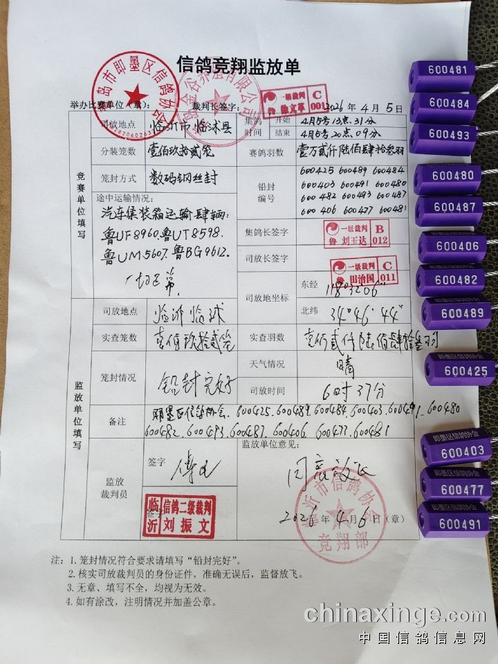 山东金谷春棚 2026年第四届春赛第一关竞翔监放单及司放照片