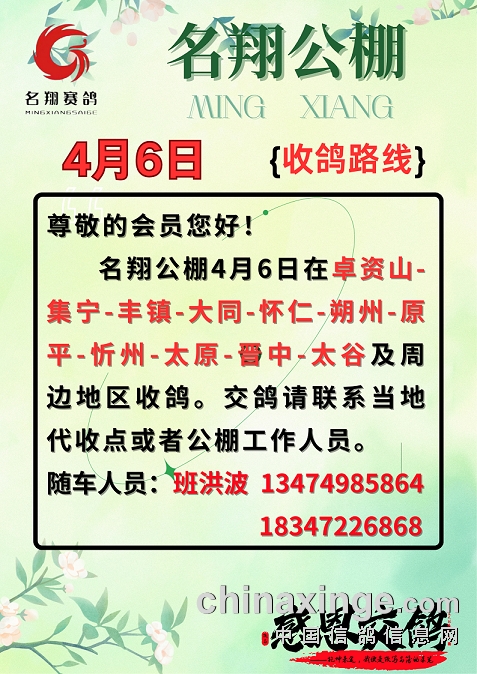 名翔公棚2026年收鸽明细(如有错误请及时联系18147288889更正)