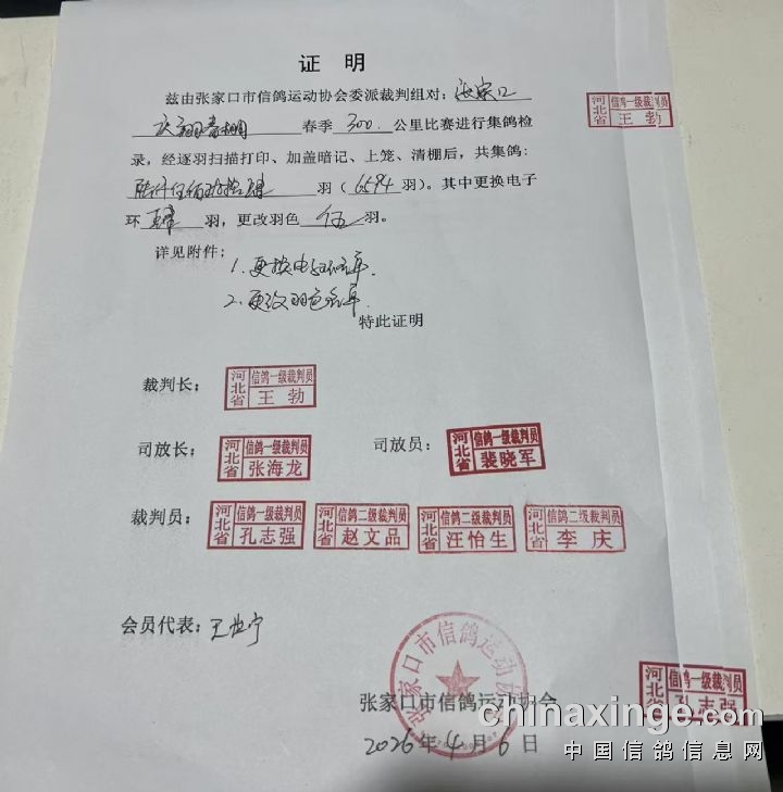 张家口庆翔春棚300公里预赛集鸽证明及现场图片