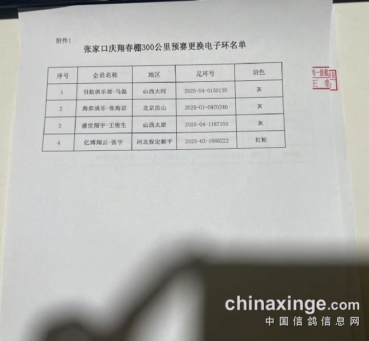 张家口庆翔春棚300公里预赛 “山城文体杯赛” 报名清单