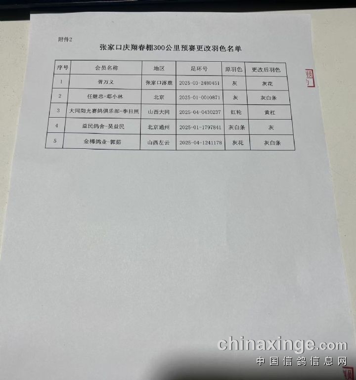 张家口庆翔春棚300公里预赛 “山城文体杯赛” 报名清单