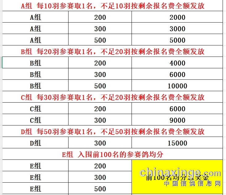 1:参赛费:500元/羽。前三名保底发放,报名超过70羽每6羽取1羽,奖3000元。如不足6羽,剩余奖金100%发放。