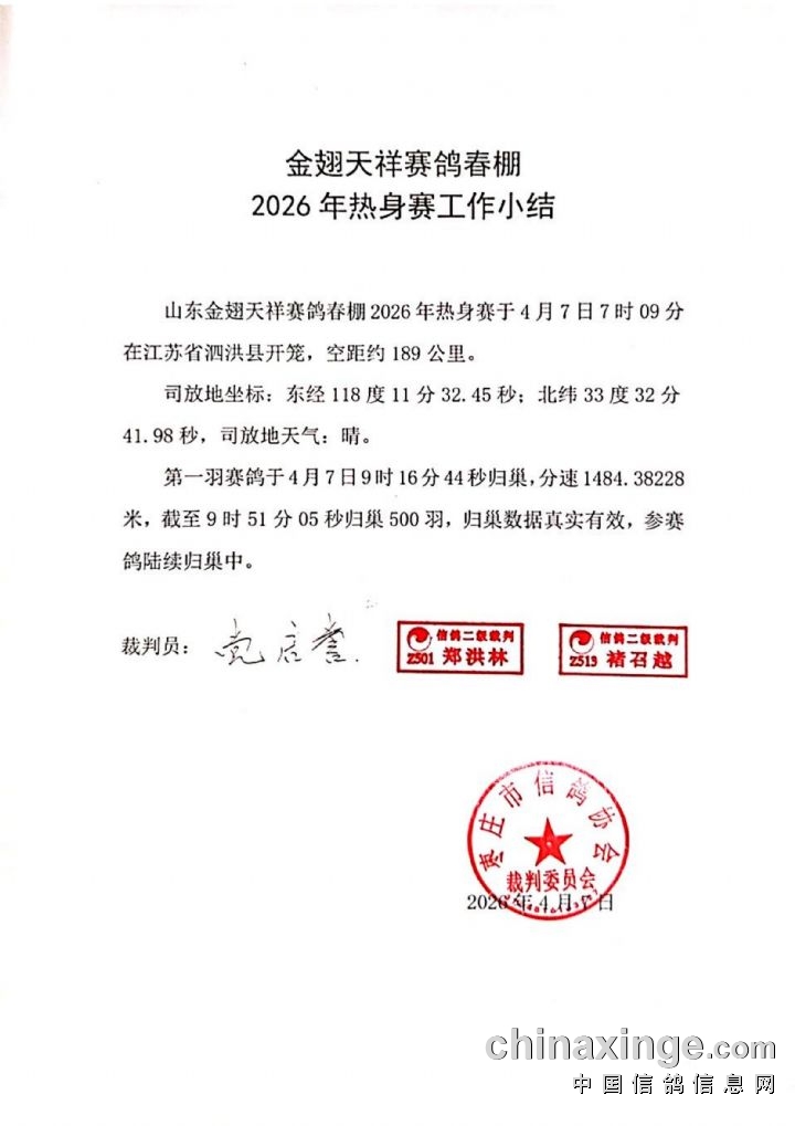 山东金翅天祥春棚 180-220公里热身赛监放单