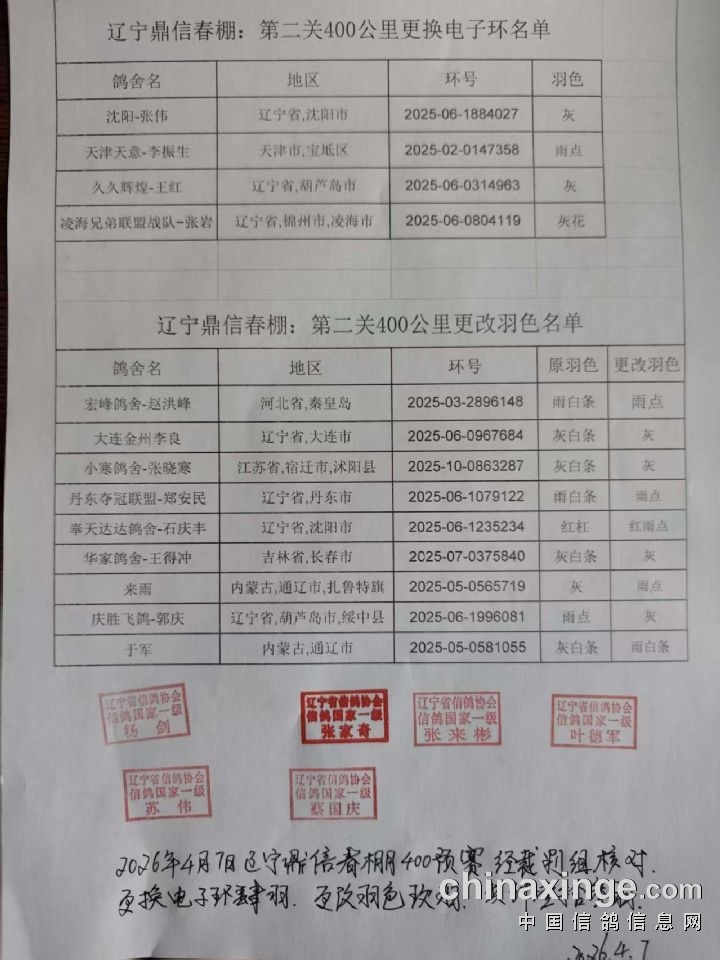 辽宁鼎信春棚:第二关400公里更换电子环和更改羽色清单