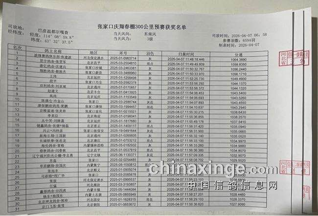 张家口庆翔春棚300公里预赛获奖名单