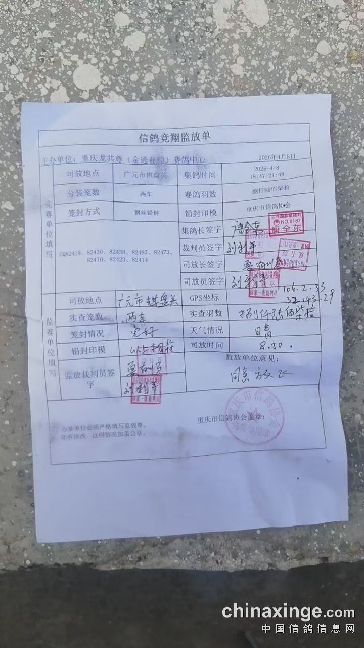 尊敬的鸽友:重庆龙共尊(金通春棚)第三关于8:50在广元市中子镇开笼,司放地经纬度:经度106.2.33 纬度32.43.29。实测空距274空距。预祝各位会员取得优异成绩!短信由第三方平台提供,有约3%的随机漏发概率,请大家以网站上的实时在线扫描数据为准!