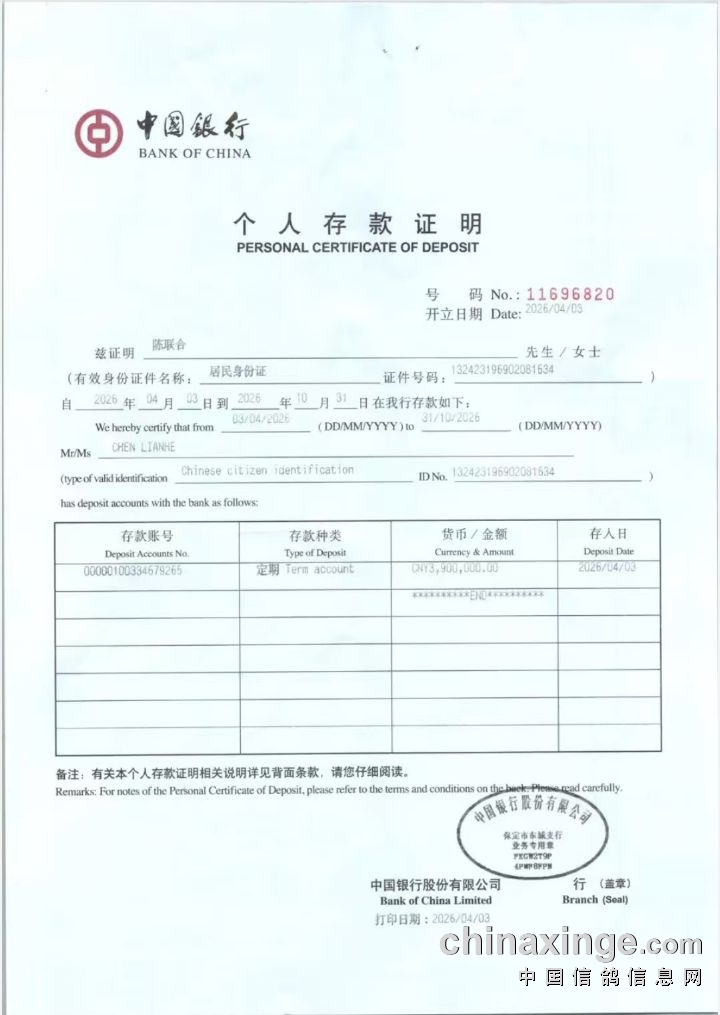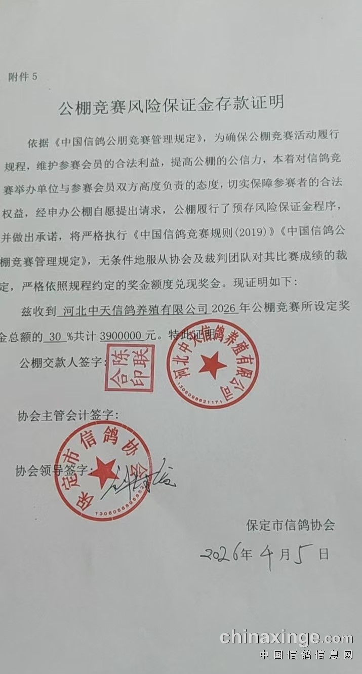 中天爱亚卡普公棚2026年竞赛风险保证金存款证明