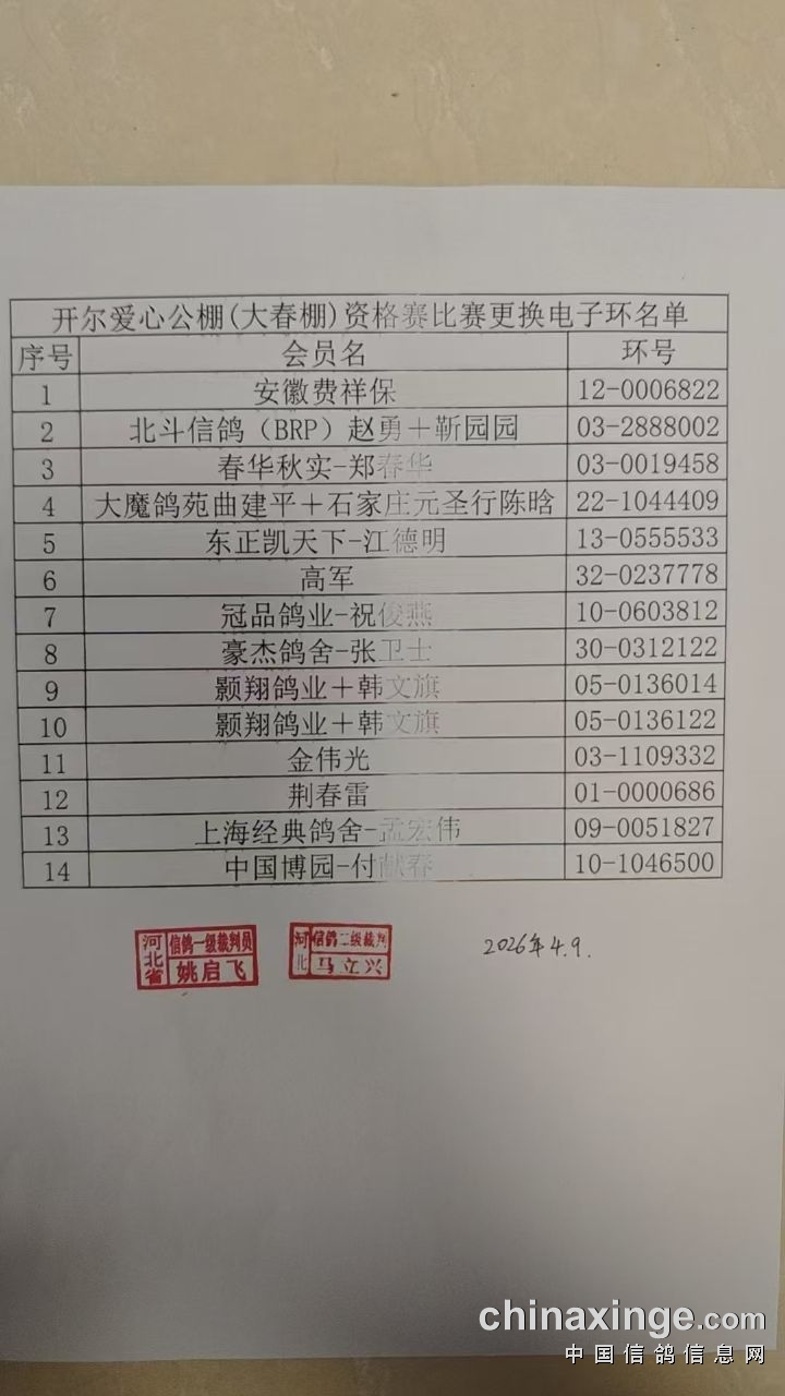 开尔爱心公棚(大春棚)资格赛集鸽更换电子环名单