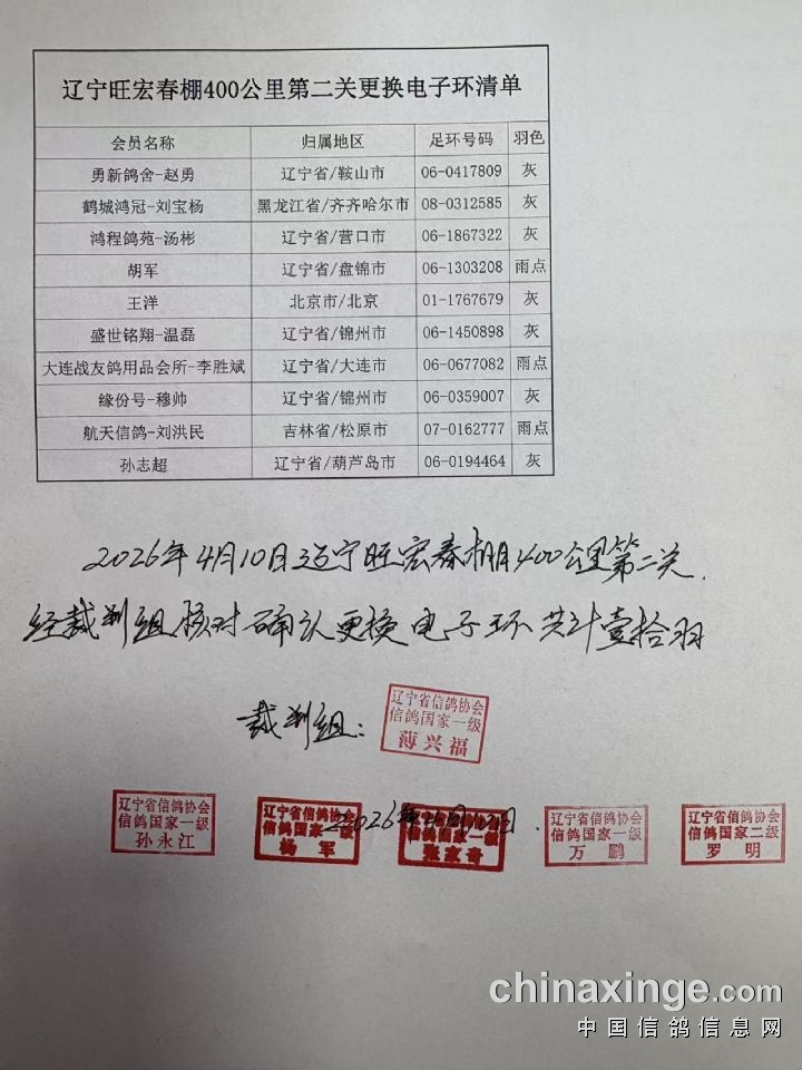 辽宁旺宏春棚:400公里第二关集鸽清单