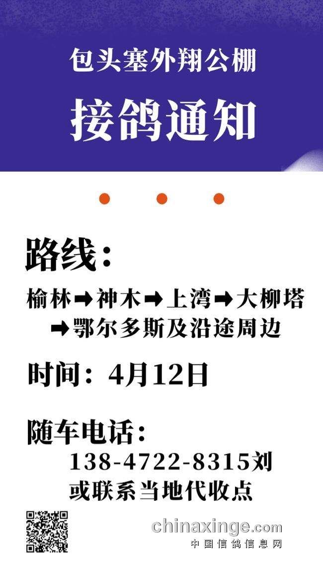 包头塞外翔公棚4月12日陕西榆林及沿途周边接鸽通知