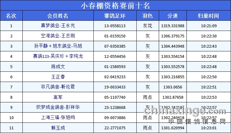 10:20,小春棚公棚上空惊现13羽先锋战鸽,仅仅1分钟后——10:21,冠军正式诞生,来自福建的鸽友真梦鸽业-王永光的一羽13-0558113灰花,分速1319.33米/分,30万大奖收回麾下。后续仅用时3分半钟,小春棚100名取奖报满。