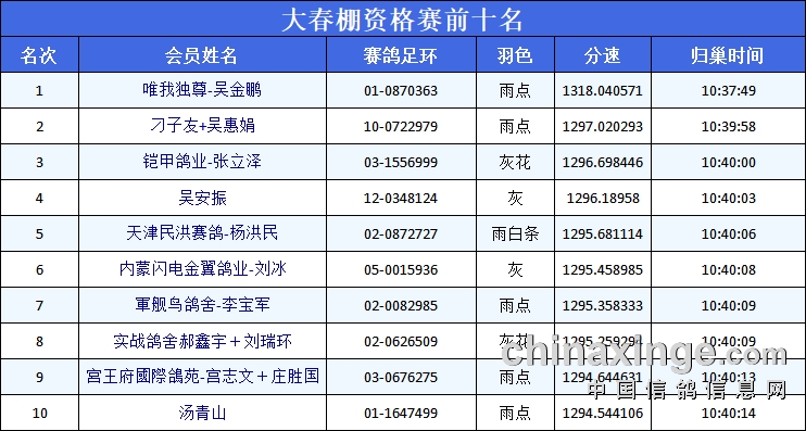 截至当日归巢结束,大春棚归巢7159羽,归巢率86.95%,小春棚归巢9041羽,归巢率78.27%。
