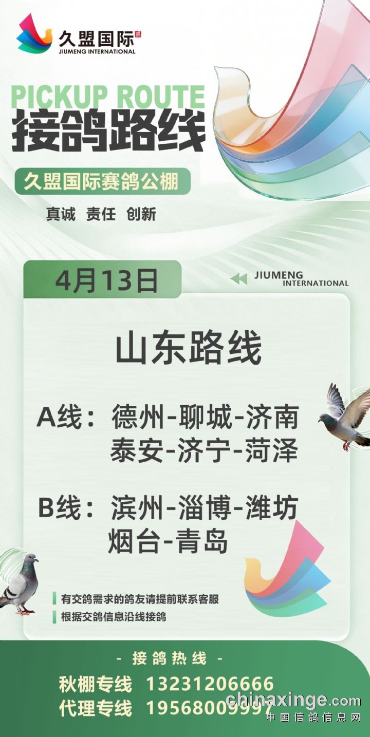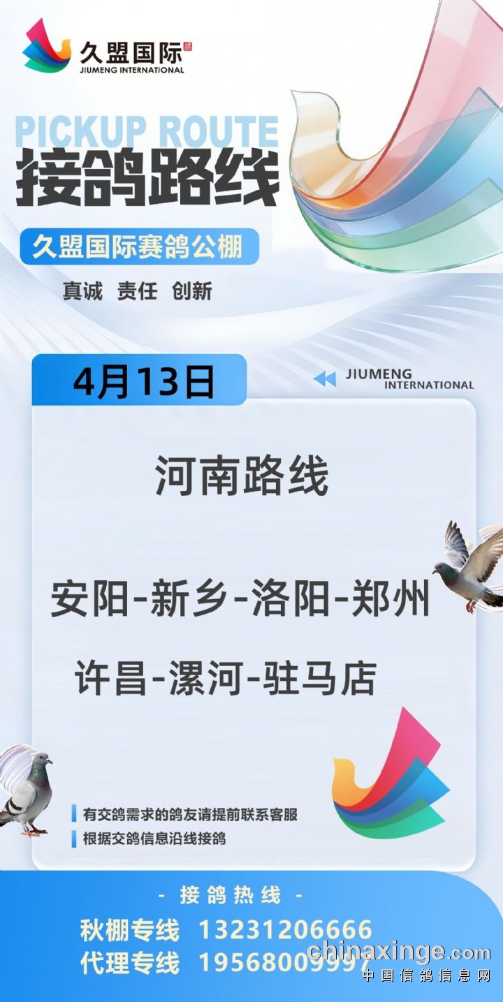 河北久盟国际赛鸽公棚(小春棚)4月13日接鸽路线