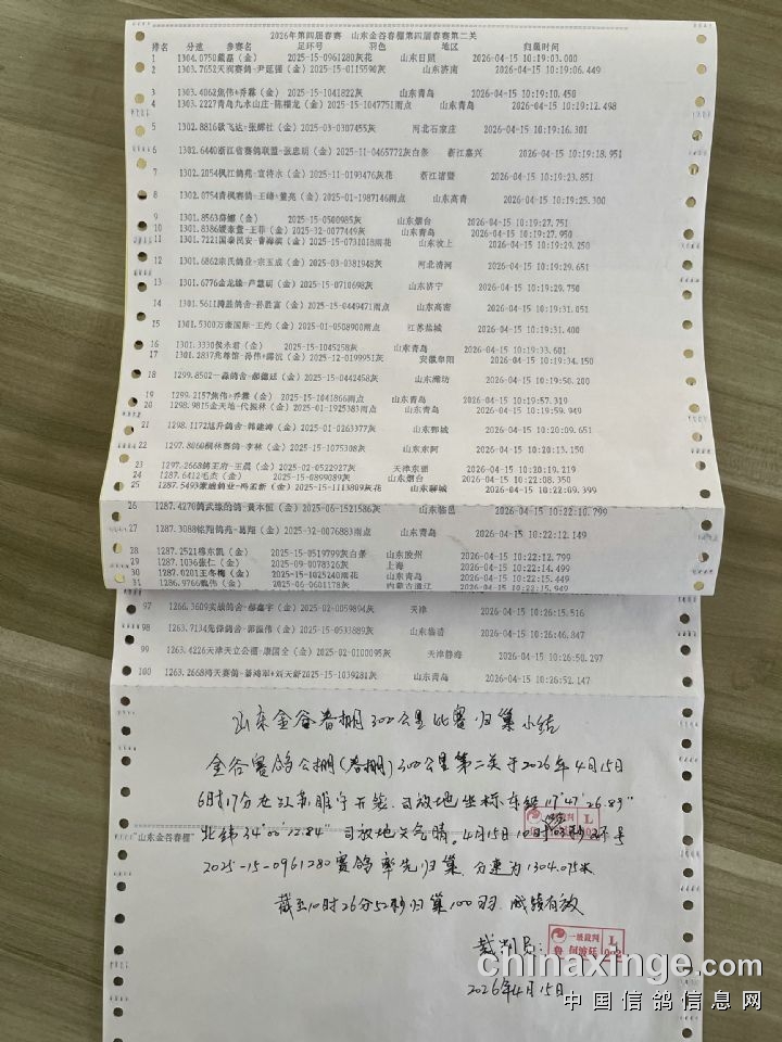 山东金谷春棚 2026年第四届春赛第三关决赛双关鸽王名单