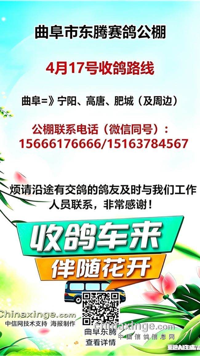 山东省曲阜东腾赛鸽公棚26届(秋)4月16号收鸽路线(3线),欢迎电联:15666176666
