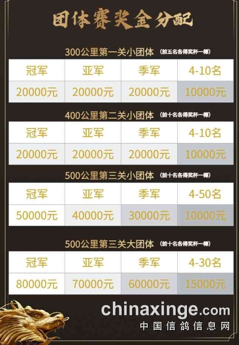 大团体同一参赛会员交鸽满10羽为一大团体,具备大团体资格,多交(10的倍数)可分A、B、C......组,以此类推。大团体以决赛480-550公里决赛前700名羽数多者为胜。如获奖羽数相同,按第一羽获奖名次先后排名。
