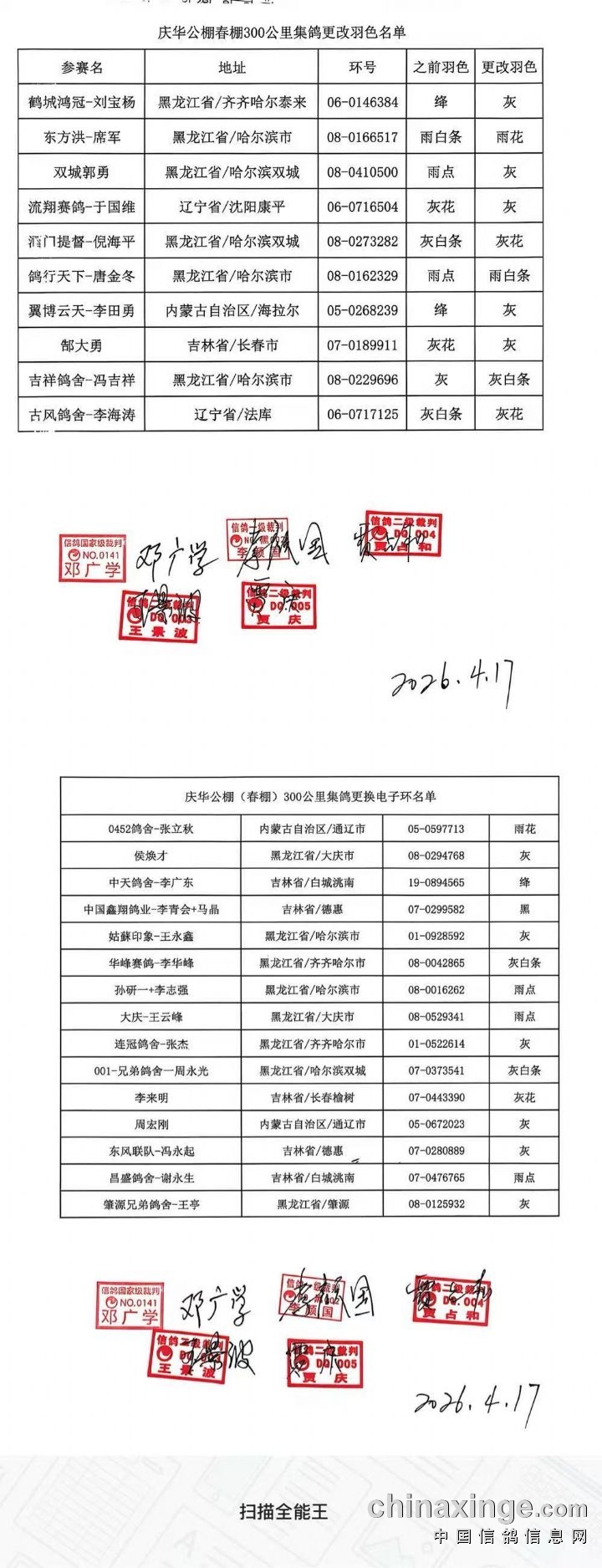 庆华公棚(春棚)4月25日400公里归巢扫描链接