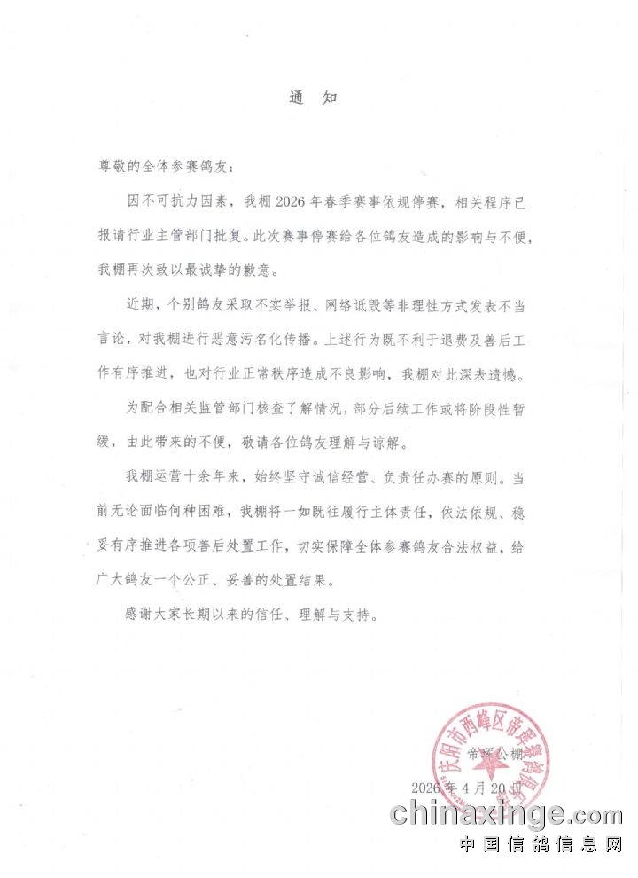 甘肃帝珲赛鸽公棚致歉信暨既定赛事终止公告