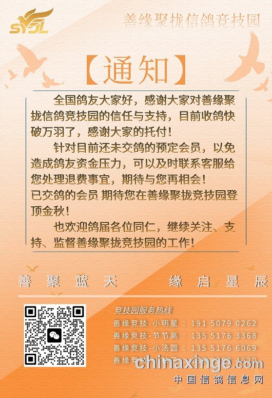 全国鸽友大家好,感谢大家对善缘聚拢信鸽竞技园的信任与支持,目前收鸽快破万羽了,感谢大家的托付!