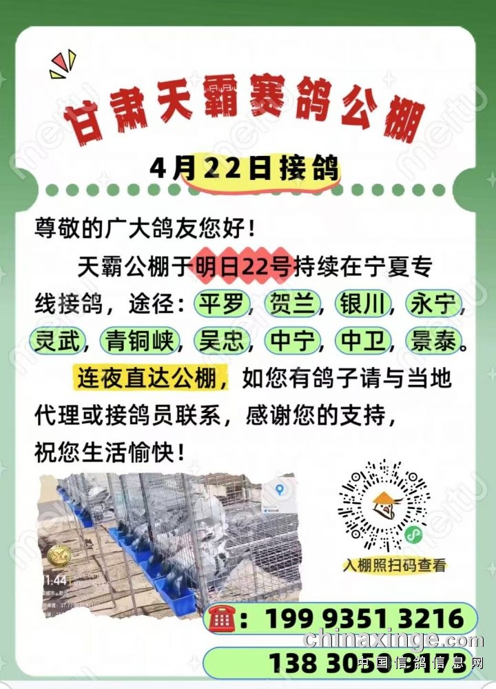 甘肃天霸赛鸽公棚4月22日接鸽路线
