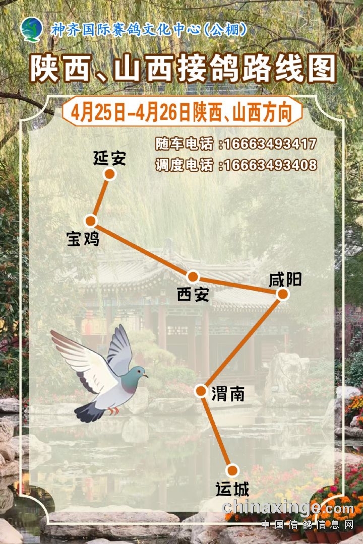 神齐国际赛鸽文化中心(公棚)4月25日-26日陕西、山西方向接鸽路线