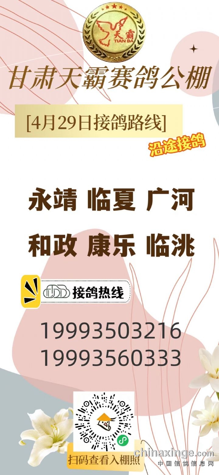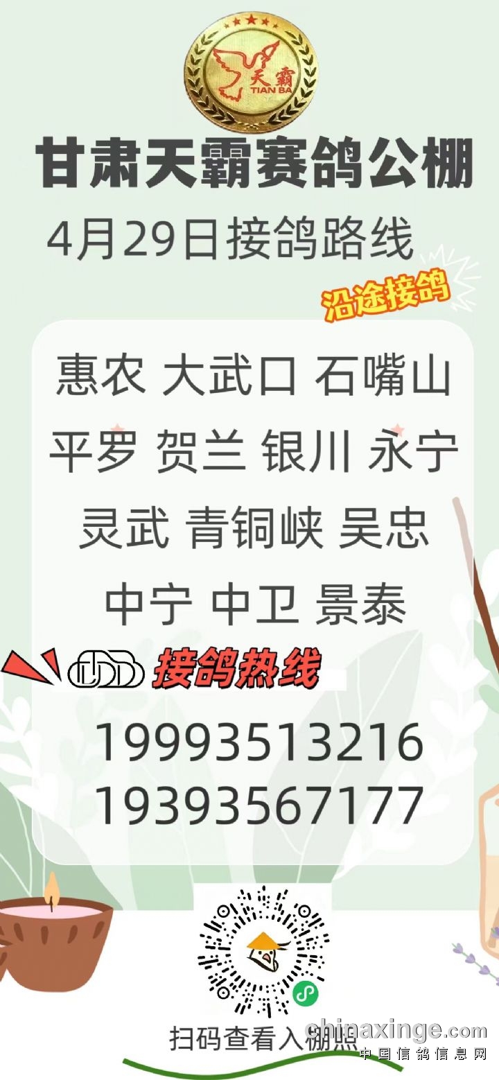 甘肃天霸赛鸽公棚4月29日接鸽路线