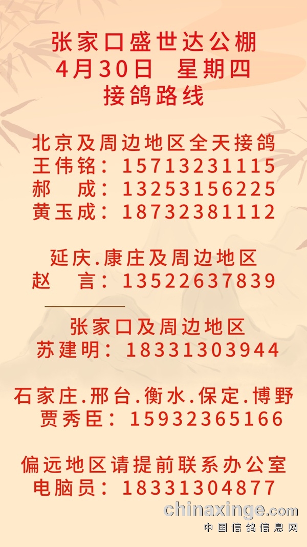 张家口盛世达公棚4月30日接鸽路线