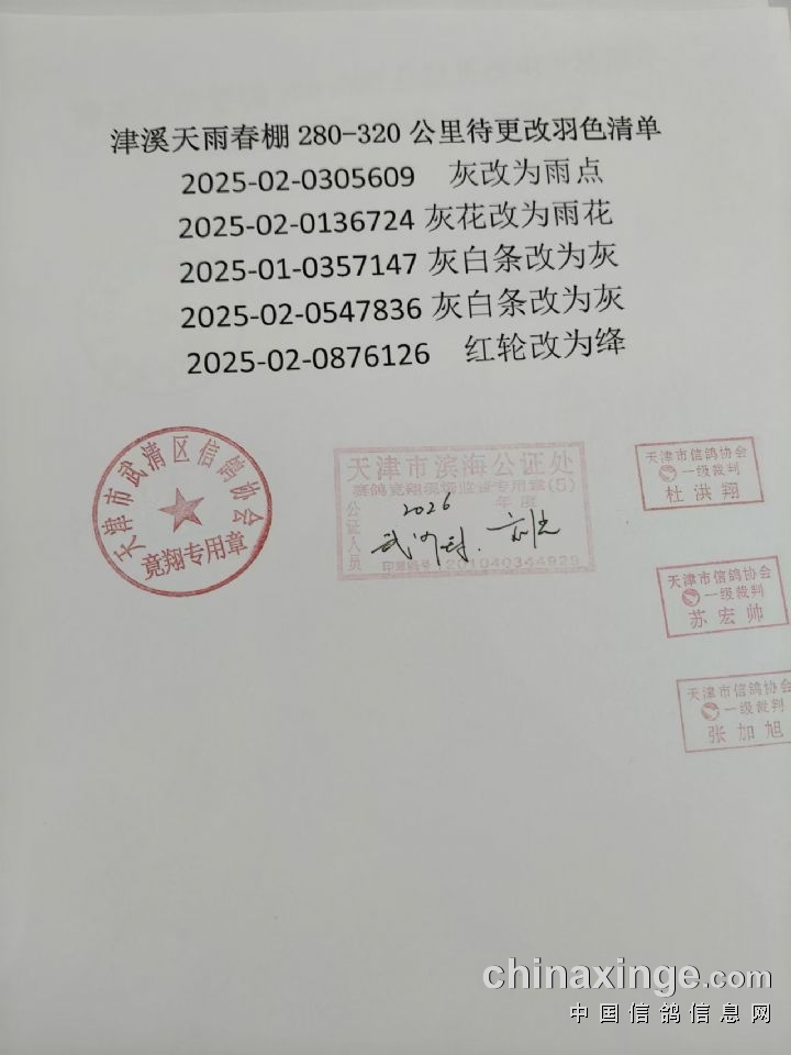 津溪天雨春棚280-320公里预赛待更改羽色清单