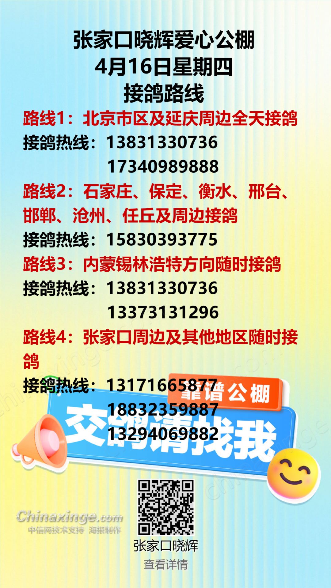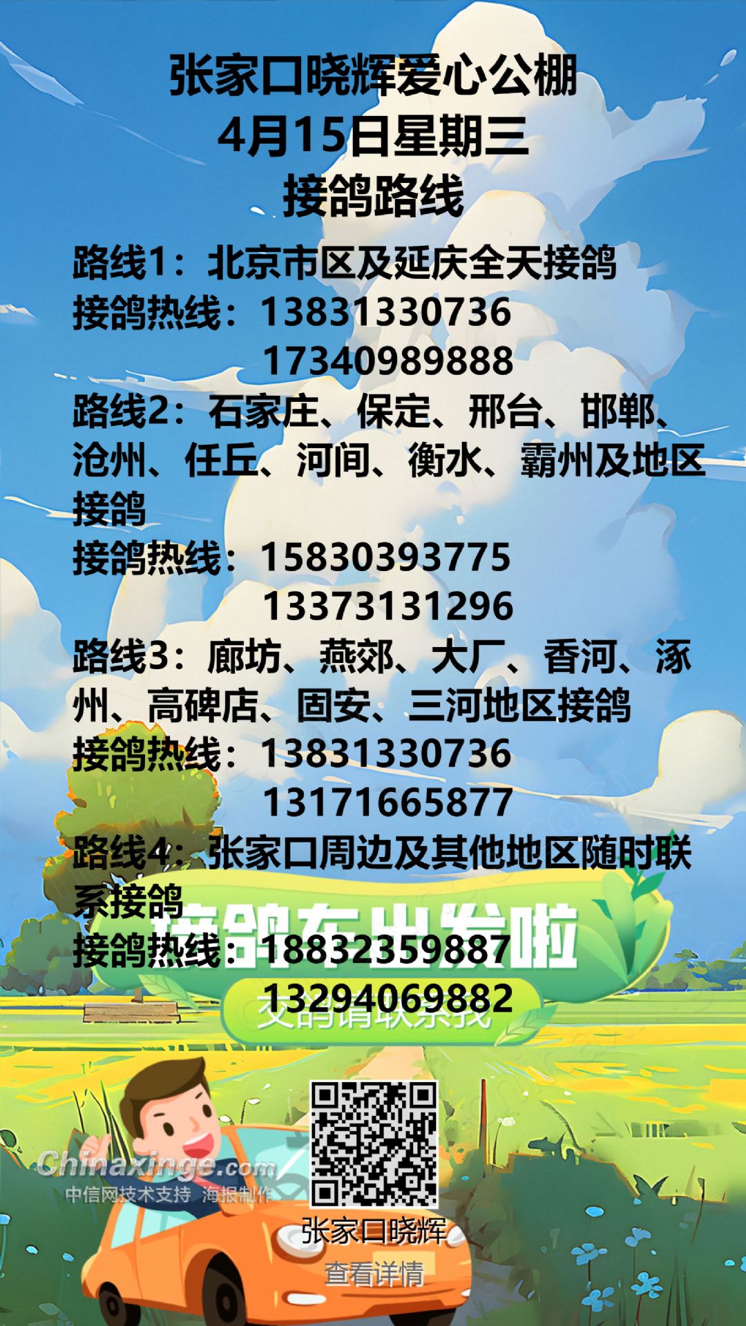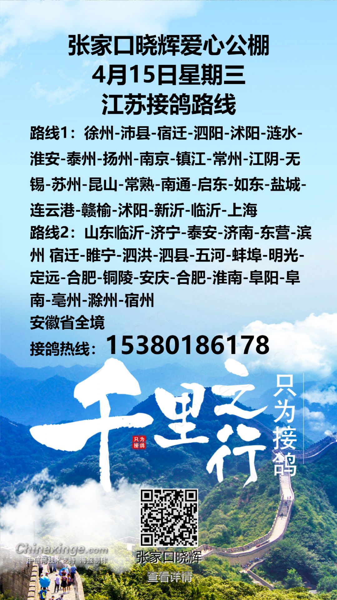 张家口晓辉爱心公棚4月15日江苏接鸽路线