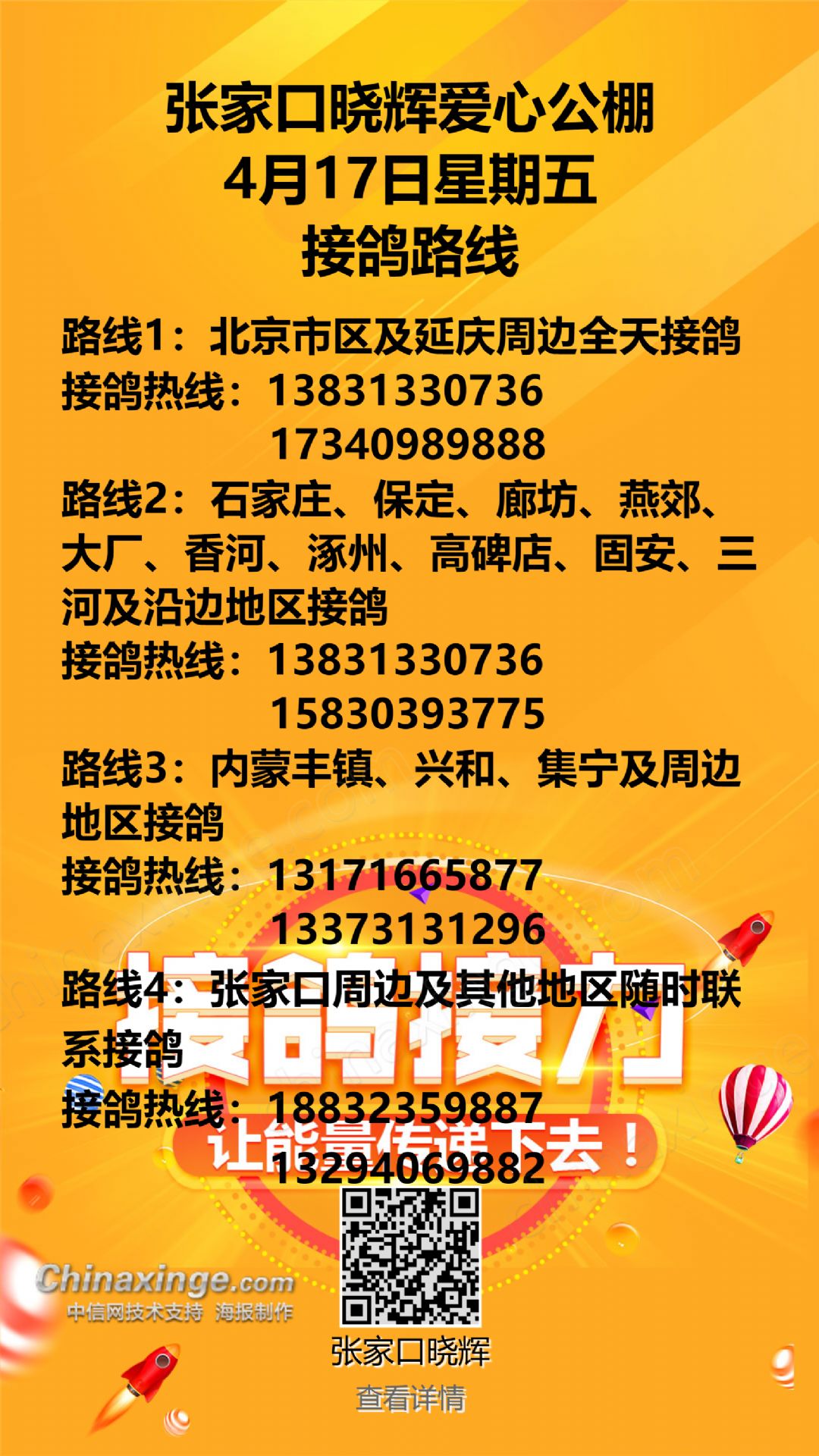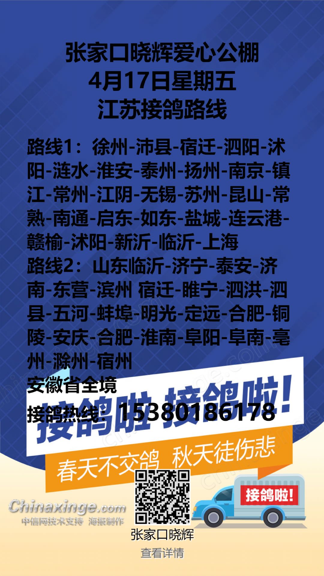 张家口晓辉爱心公棚4月17日江苏接鸽路线