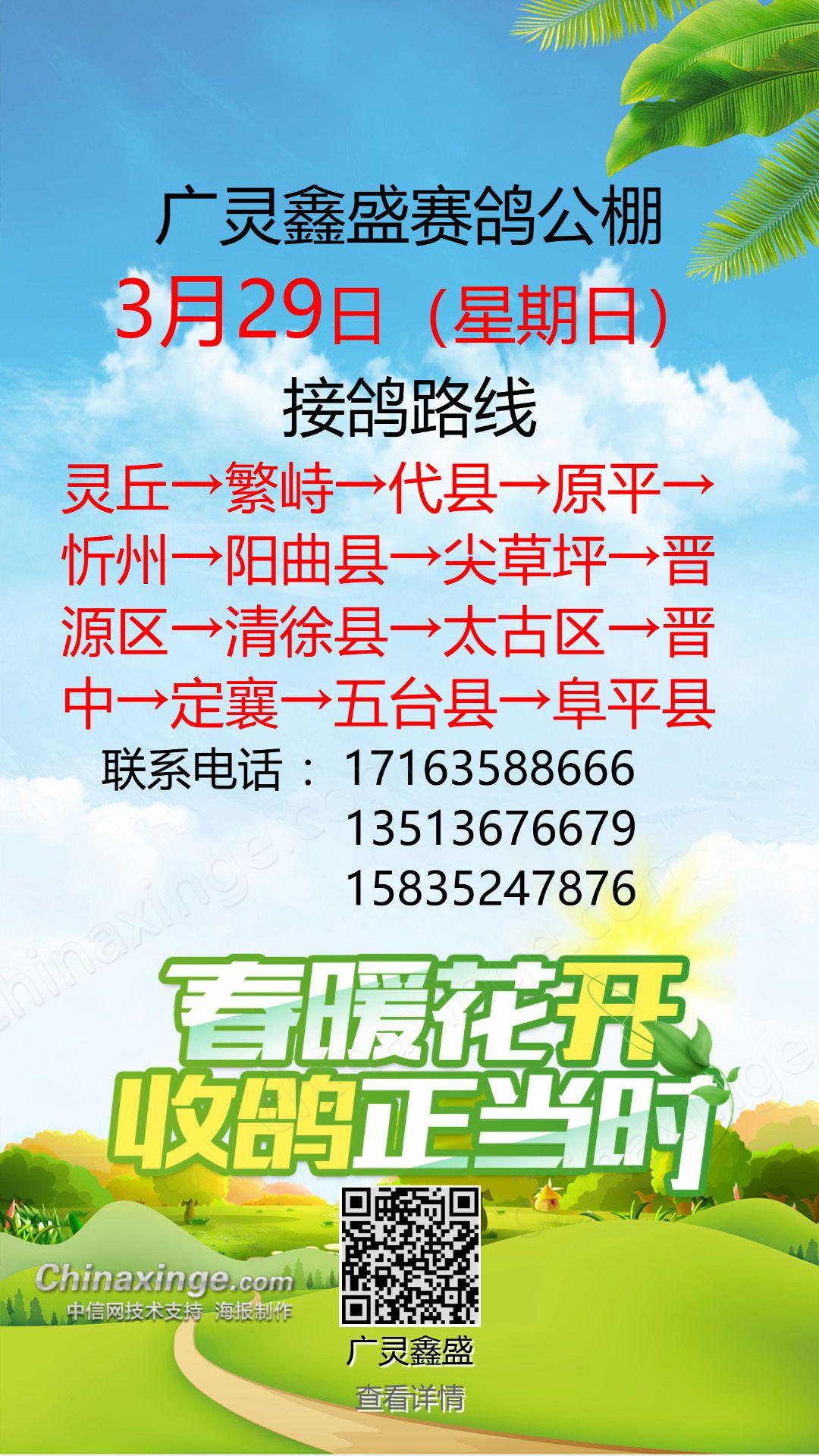 广灵鑫盛赛鸽公棚3月29日(星期日)接鸽路线