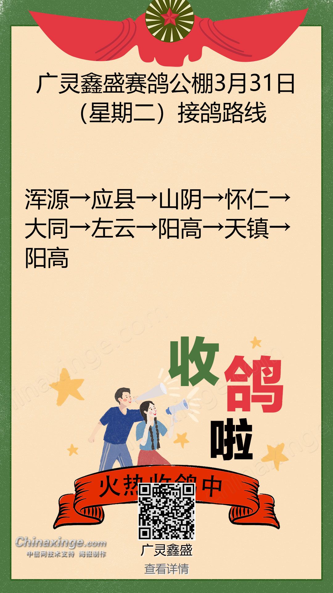 广灵鑫盛赛鸽公棚3月31日(星期二)接鸽路线