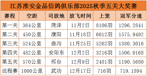 踏破五关云作甲,横穿千里铁骨铮。 豪杰并起风云会,群英争辉苍穹间。 12月中旬,江苏淮安金品信鸽俱乐部2025年秋季五关大赛圆满落幕。自11月初首关鸣锣开赛以来,8106羽精锐赛鸽踏上征途,先后跨越364公里、450公里、523公里、481公里和570公里五道雄关,一路奋勇争先,强者称王。至决胜第五关,仍有1700余羽战将成功完成全程挑战,羽羽皆精英。紧随其后的千公里远程赛,一羽两战千公里的雌鸽霸气称王。前19名获奖鸽主中,七成为近年千公里赛场常胜选手,堪称一场老牌豪强的终极对决,实力深厚。最终,本届秋赛鸽王总冠军花落吕泽生鸽友麾下一羽砂眼灰雄,足环2025-10-1716412。此鸽全程极具爆发且始终发挥稳定:首关第35名,二关228名,三关216名,四关跃升至第3名,五关再以第33名完赛。之后凭借五关总分速6620.9834米/分的成绩,以绝对优势加冕鸽王总冠军,无愧为本届秋赛最强战将。 精兵强将已就位,立即参拍抢占先机!1月9日,江苏淮安金品信鸽俱乐部将举行2025年获奖鸽颁奖暨拍卖大会,届时还联合中信网开启“现场与网络同步拍卖+视频直播”服务,鸽友们可登录中信网,提前出价拍好鸽,边看直播边竞价,冠军奖鸽带回家!即刻下载中信网手机APP,轻松出价,快人一步!